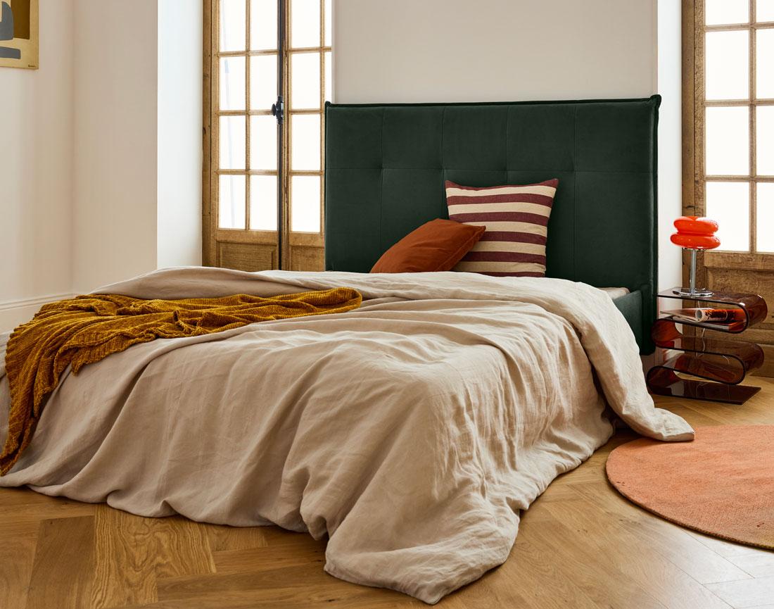 Tête de lit : Mousse polyéther de densité 16kg/m3 + ouate 200g/m2 et 350g/m3