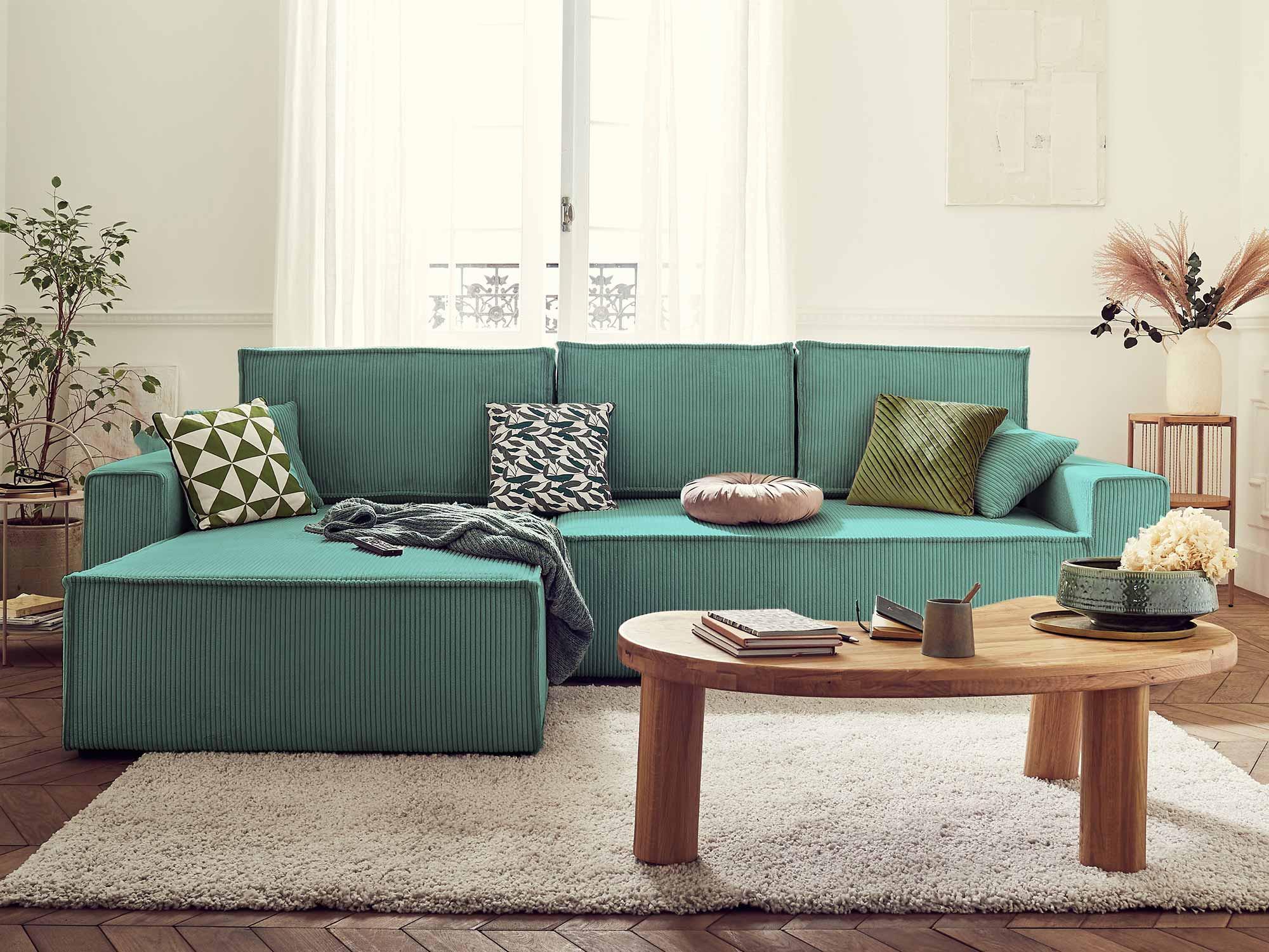 Ce canapé est disponible en coloris beige, bleu ardoise, gris anthracite, gris foncé, jaune, taupe et vert.