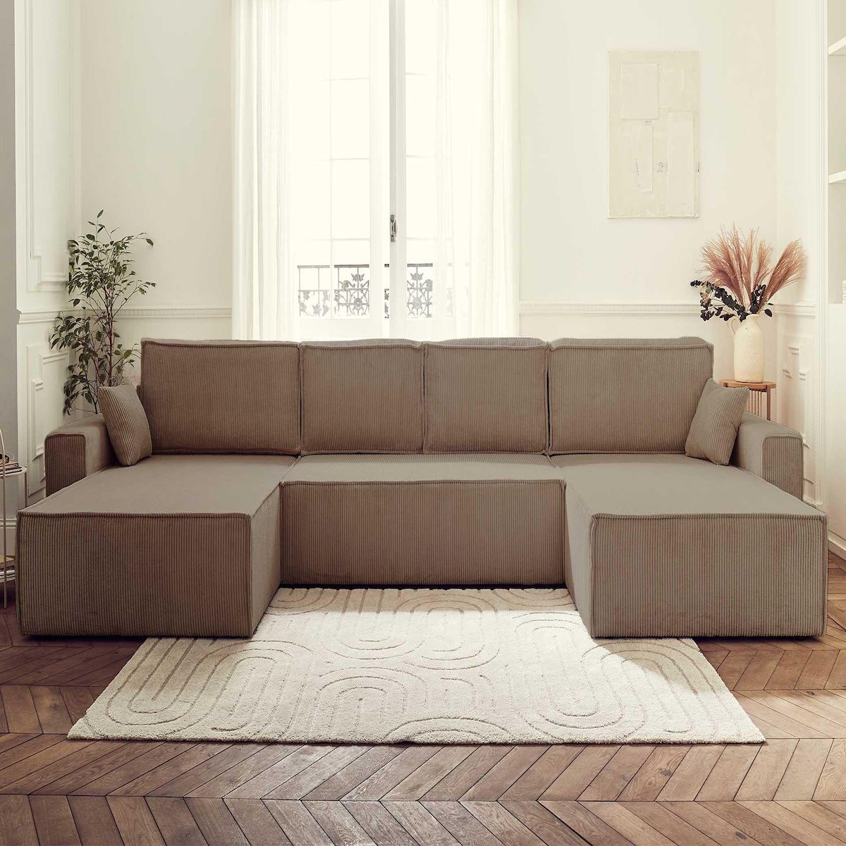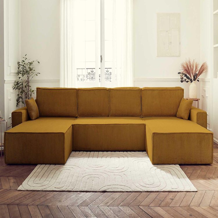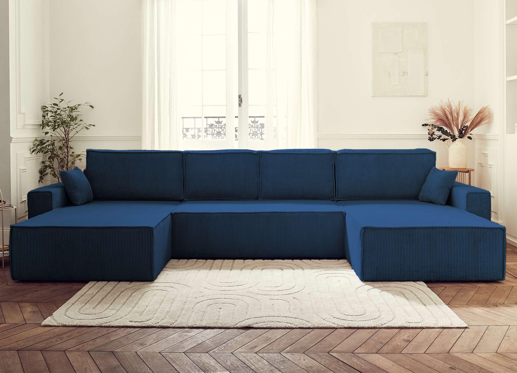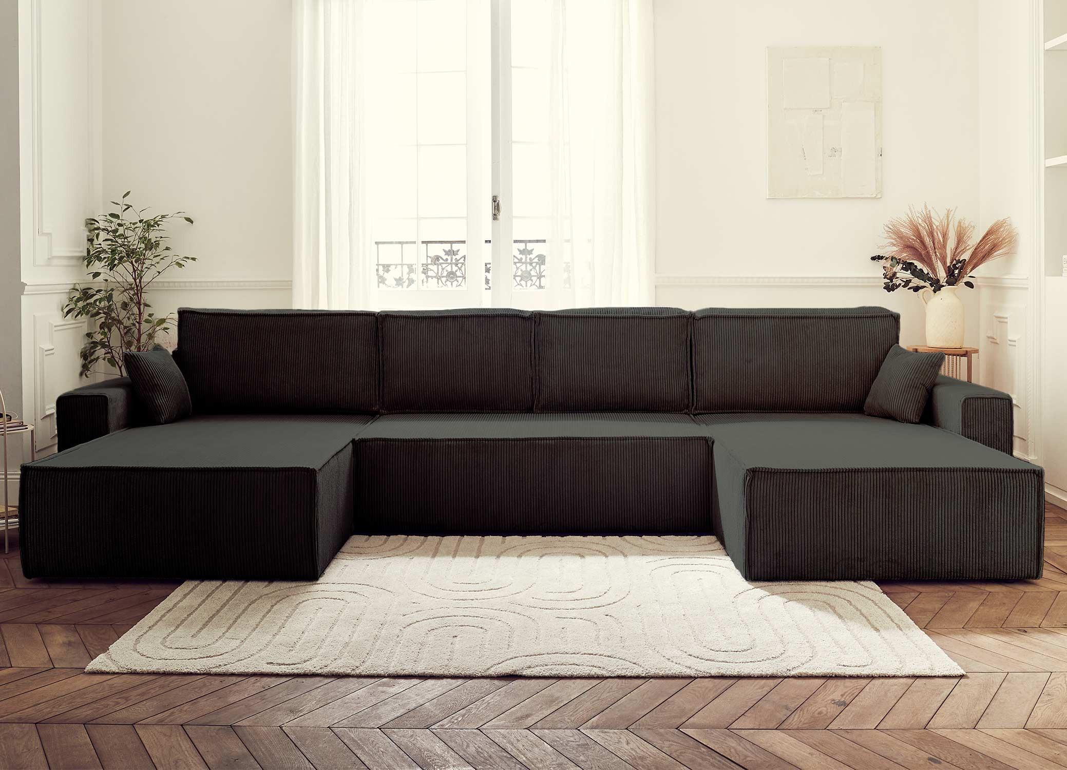Dellia - canapé panoramique en u - 7 places - convertible - avec coffre - en velours côtelé