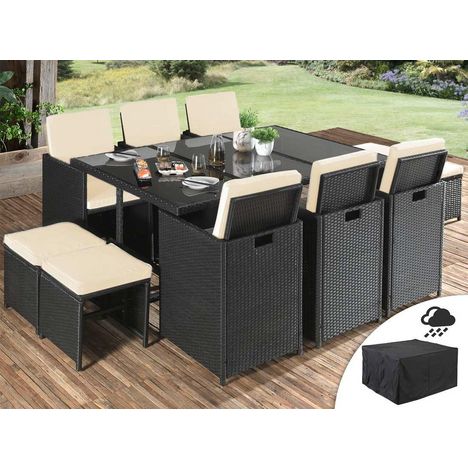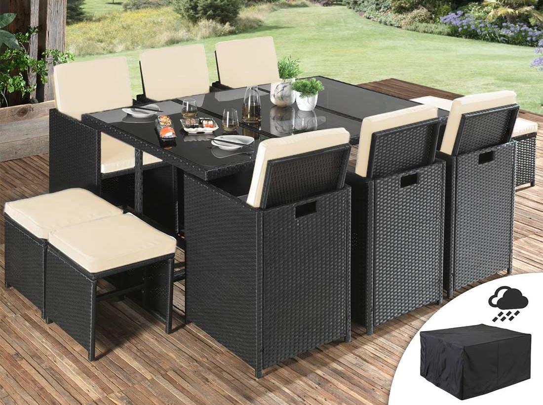 Fira - salon de jardin encastrable 10 places - en résine tressée - noir avec coussins beiges + housse de protection