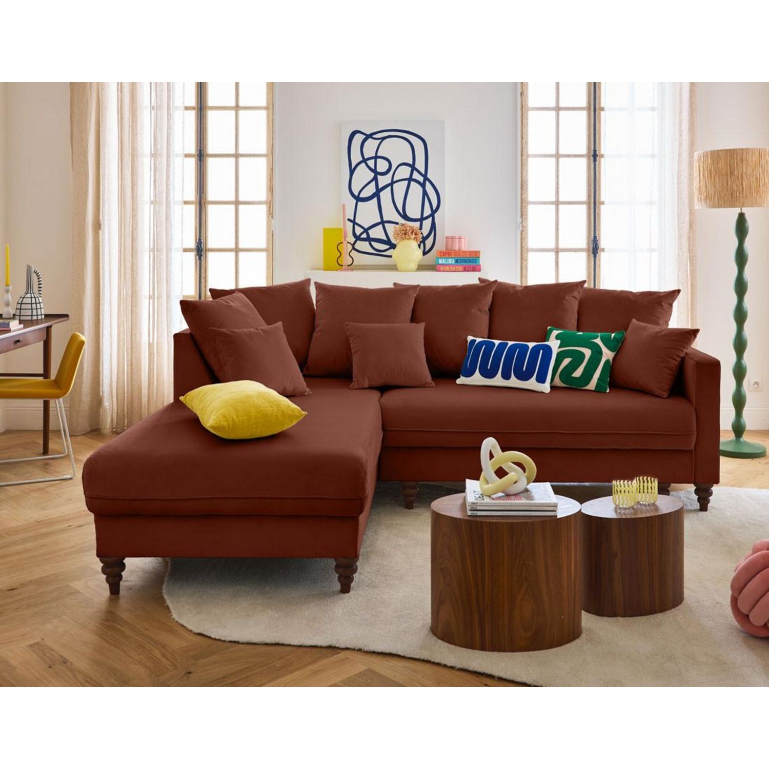 Le canapé Flamingo à angle gauche est fabriqué en Europe, un gage de durabilité et de qualité. Vous pouvez, à votre guise, personnaliser l'allure de votre canapé en sélectionnant l'un de ses six coloris au choix : vert, beige, bleu, gris, noir ou terracotta.