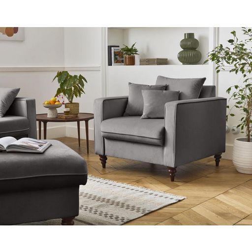 - Détail des matières : Assise : Mouse polyuréthane 30kg/m3 – Dossier : Flocons de mousse – Ressorts ondulés – Structure en bois et panneaux de particules – Revêtement en velours 100% polyester – Pieds en bois foncé