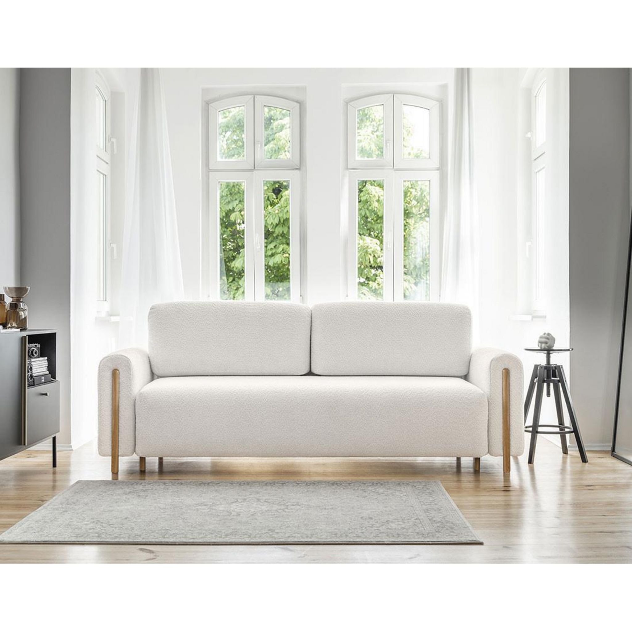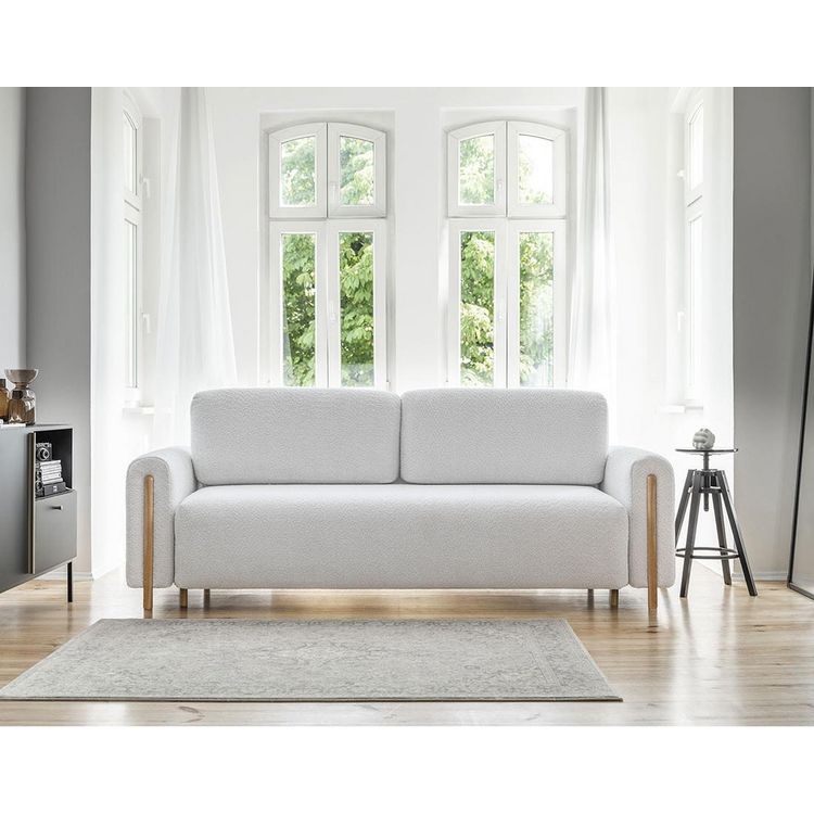 Le canapé droit 3 places Glendale se distingue par son parfait mélange entre design et praticité. Vous apprécierez son design épuré et son revêtement en tissu bouclette qui apporte un aspect doux et chaleureux à l'ensemble du canapé. De plus, ses pieds en bois clairs et apparents ajoutent une touche cosy au canapé Glendale.