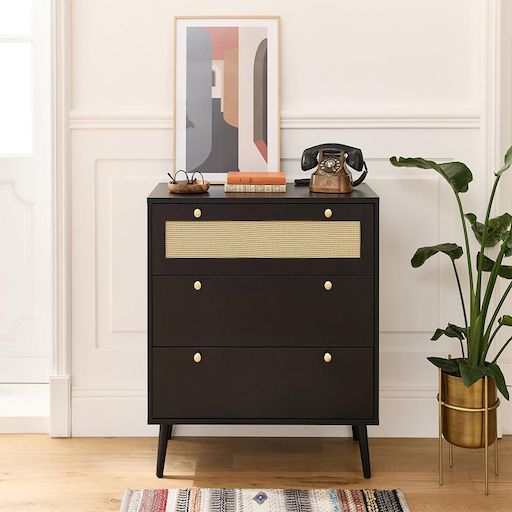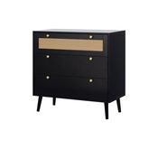 La commode Goto noire séduit par sa façade en cannage qui allie parfaitement une touche naturelle à un style vintage. Ses dimensions de 80 cm en font une pièce discrète mais impactante dans les espaces plus restreints. Avec ses poignées dorées, elle ajoute une note élégante à une chambre ou une entrée. Ce meuble n'est pas qu'un simple ajout décoratif, il apporte une personnalité distincte à votre intérieur. Vous cherchez à compléter votre décoration avec du caractère ? Cette commode est faite pour vous !