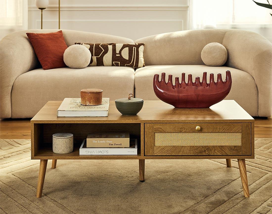 Goto - table basse - effet bois et cannage - 1 tiroir et 1 niche - 110 cm