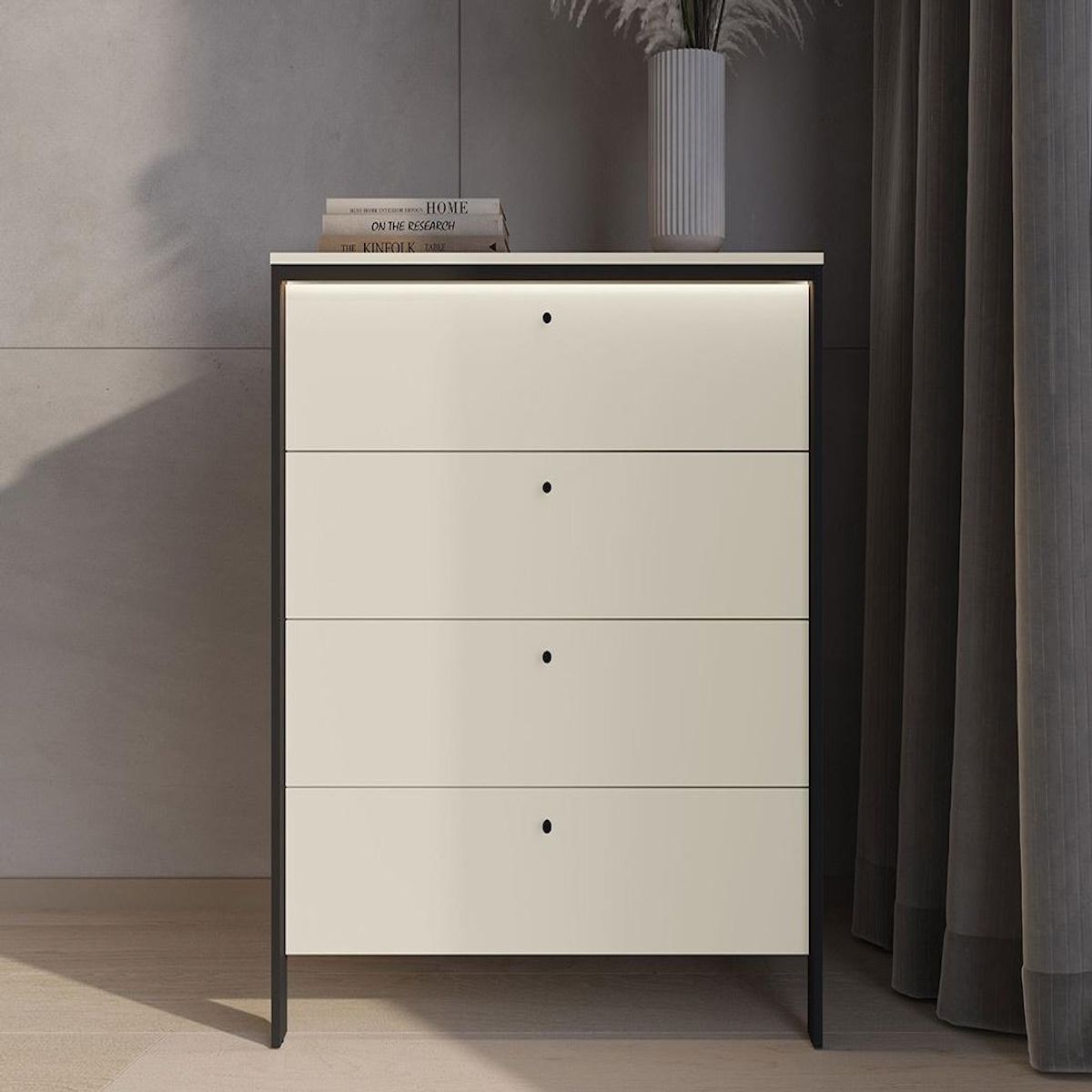 Organisez facilement vos affaires avec la commode Kimi 4 tiroirs. Ses tiroirs spacieux offrent un espace idéal pour ranger vêtements, accessoires ou linge de maison, tout en gardant votre chambre parfaitement ordonnée. Chaque tiroir glisse facilement pour un accès rapide et sans effort.