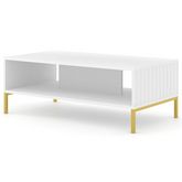 Fabriquée en Europe, la table basse Lara garantit une qualité durable et un montage rapide grâce à des instructions claires. Ses rangements spacieux sont idéaux pour garder magazines et télécommandes hors de vue, tout en conservant un style chic et épuré. Les façades lignées et les pieds dorés ajoutent une touche tendance, s'intégrant aisément avec les autres éléments de la collection Lara pour un ensemble harmonieux et fonctionnel.