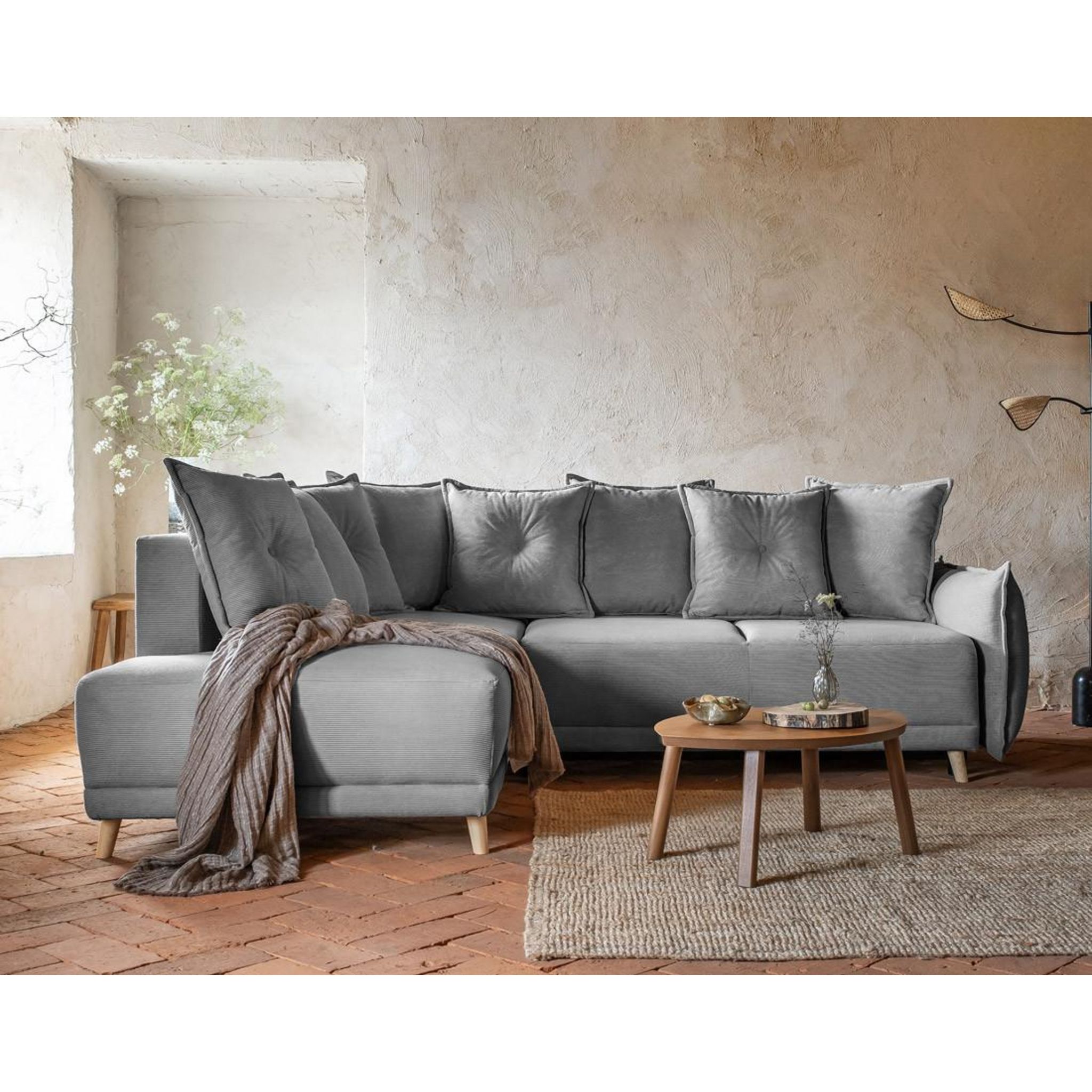 Minimaliste, fonctionnel et tendance, le style contemporain s'invite dans votre salon avec le canapé d'angle 5 places Lena ! Ses pieds en bois, ses lignes épurées, son revêtement en velours côtelé, doux au toucher, et son assise confortable donneront une touche chaleureuse à votre décoration d'intérieur. Grâce à ses accoudoirs originaux en forme de coussin, le canapé Lena apporte de l'originalité et de l'authenticité à votre intérieur.