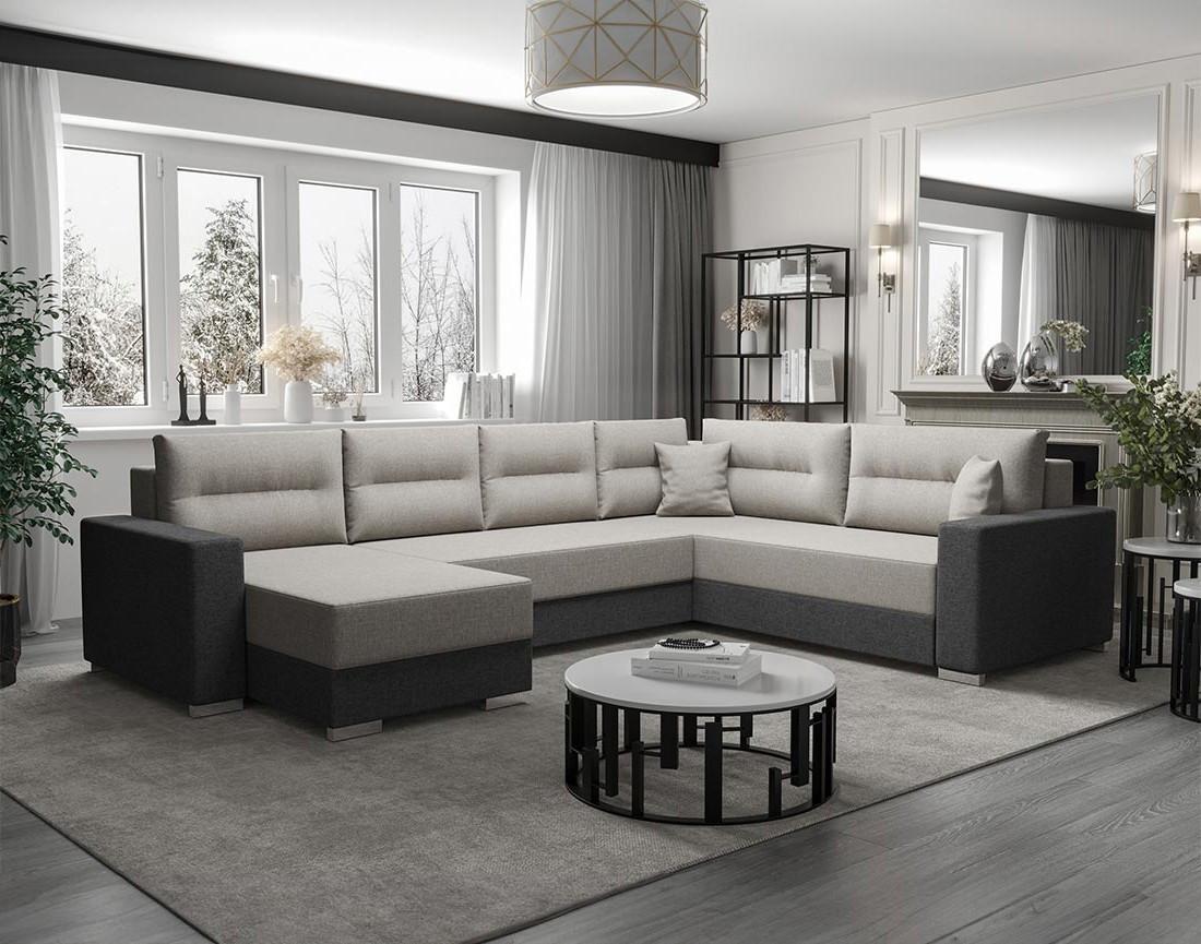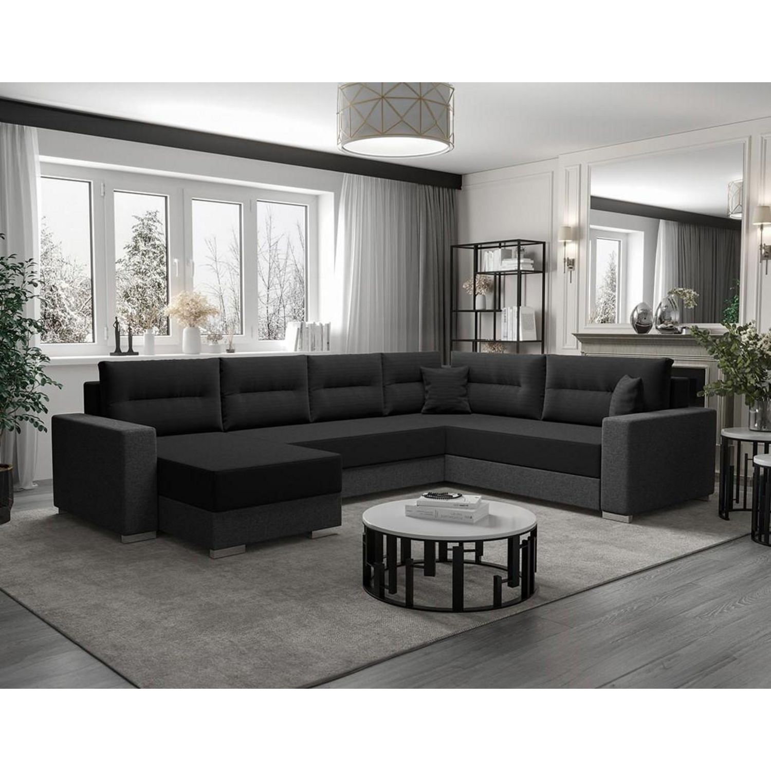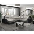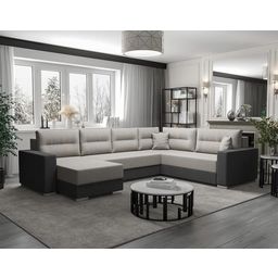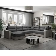 Leslie - canapé panoramique d'angle réversible 7 places convertible avec coffre en tissu
