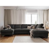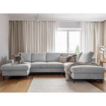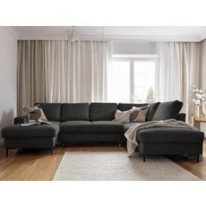 Plusieurs fonctions sont disponibles afin que votre canapé d'angle panoramique Lilly ne soit pas uniquement beau mais aussi pratique ! Pour accueillir vos proches occasionnellement ou encore profiter pleinement de votre canapé le dimanche, la fonction convertible est disponible en quelques secondes. Il vous suffit de tirer le tiroir qui se situe sous l'assise et de remonter la partie à l'aide de la sangle. Sous la méridienne, se trouve un coffre de rangement. Vous pouvez y ajouter des plaids, des coussins ou autres grâce à son espace suffisant pour cela. Petit plus, la poche dans l'accoudoir est pratique afin de ne pas perdre ses télécommandes.