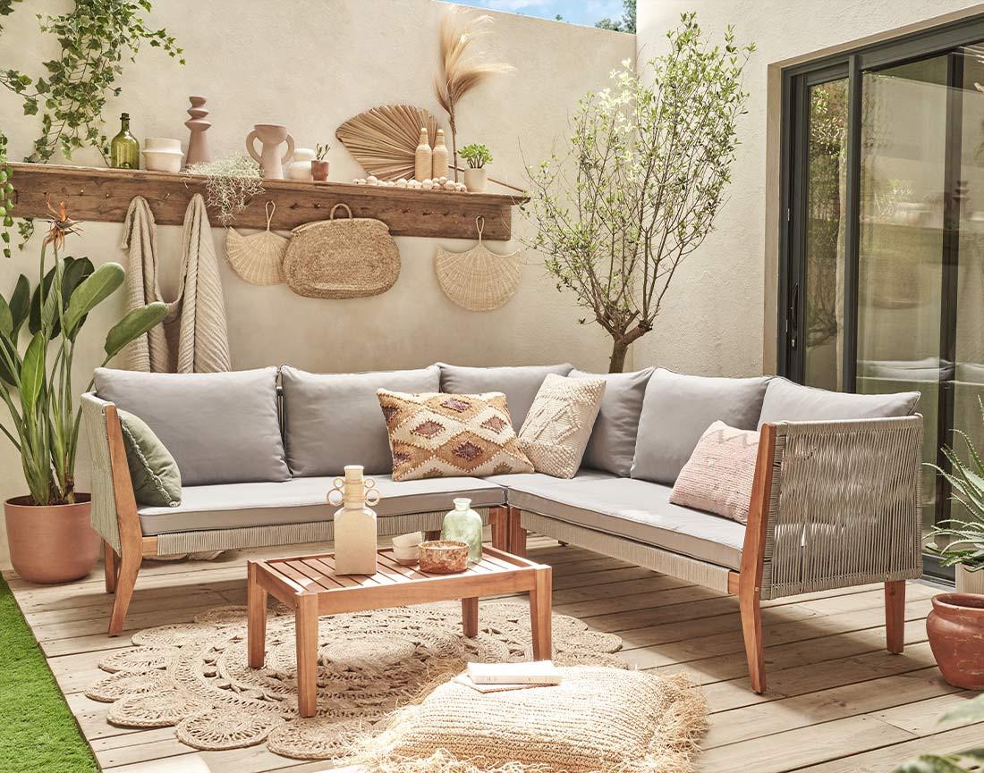 Prenez votre petit-déjeuner ou profiter d'un apéro convivial entre amis ou en famille avec le salon bas de jardin Papua. Cet ensemble de jardin en bois d'acacia et de corde est composé d'un canapé d'angle pouvant accueillir 5 personnes et d'une table basse. La table basse sera parfaite pour y déposer votre café ou votre boisson préférée ou encore de quoi grignoter tandis que le canapé d'angle vous permettra d'échanger facilement avec vos convives.