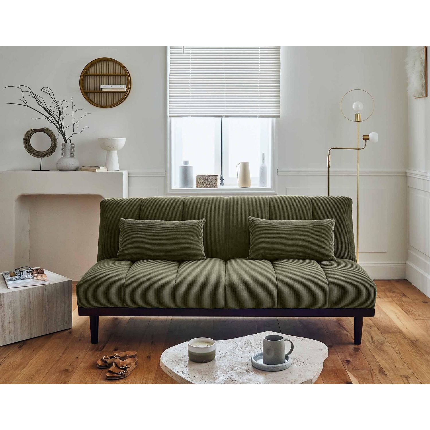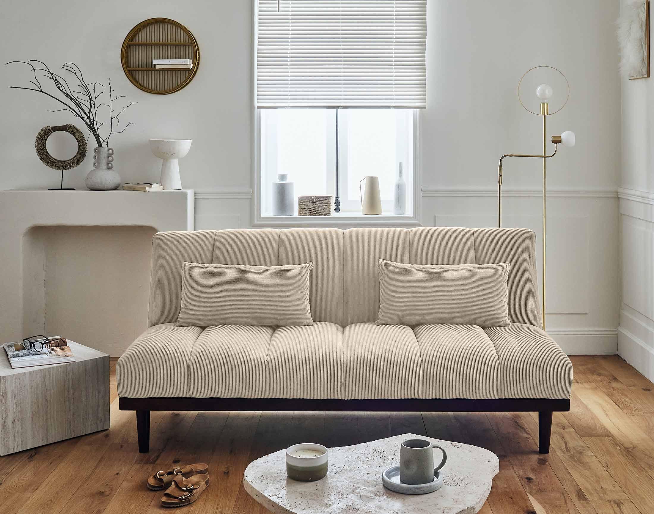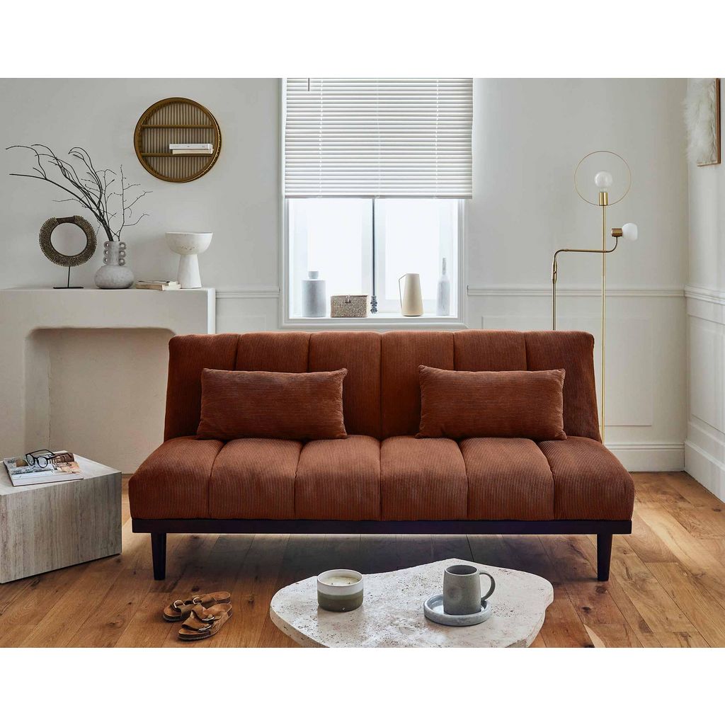 Présentation de la collection : Craquez pour le look chaleureux du canapé clic-clac Samarra en velours côtelé et aux pieds en bois. Idéal pour optimiser votre espace, cette banquette-lit se transforme en un couchage d'appoint rapidement.