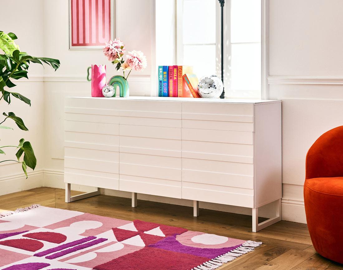 Fort d'un design résolument moderne et minimaliste, le buffet Sofia se distingue par ses façades au motif linéaire et son coloris blanc très tendance qui fera sensation dans votre décoration.