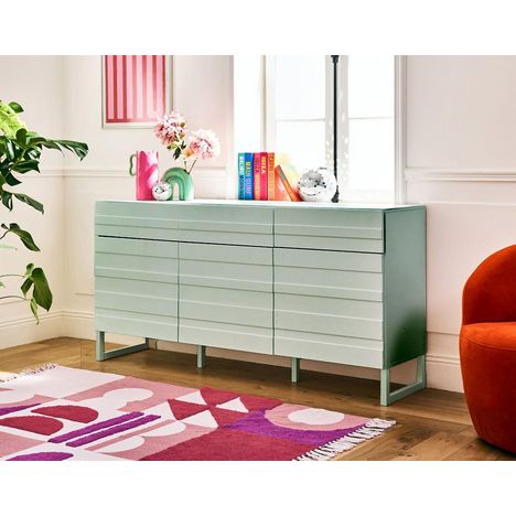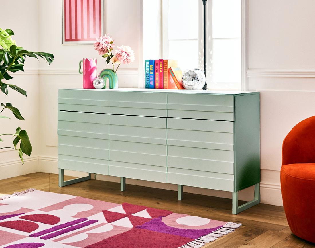 Fort d'un design résolument moderne et minimaliste, le buffet Sofia se distingue par ses façades au motif linéaire et son coloris vert sauge très tendance qui ne passera pas inaperçu dans votre décoration.En plus d'apporter du charme à votre pièce à vivre, ce buffet de 110 cm vous offrira de nombreuses solutions de rangement, très pratiques au quotidien ! En effet, derrière ses deux portes, vous retrouverez quatre espaces de rangement. Celui-ci possède également deux tiroirs pour un gain de place optimal. Vous pourrez ainsi y ranger votre vaisselle, vos documents, vos jeux de société et bien plus encore pour un intérieur ordonné.