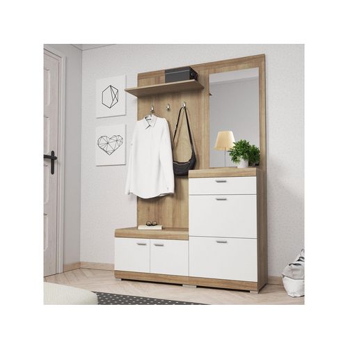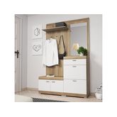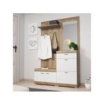 Apportez une touche moderne et fonctionnelle à votre intérieur en adoptant ce meuble d'entrée au coloris bicolore bois et blanc. Idéal pour optimiser votre espace de rangement, le vestiaire Thea est composé d'un panneau porte-manteau avec étagère et miroir intégrés, d'un tiroir, de deux armoires à chaussures et d'un compartiment fermé.
