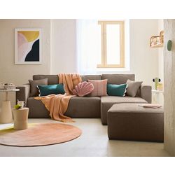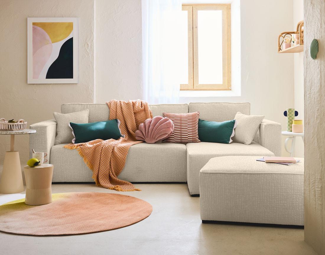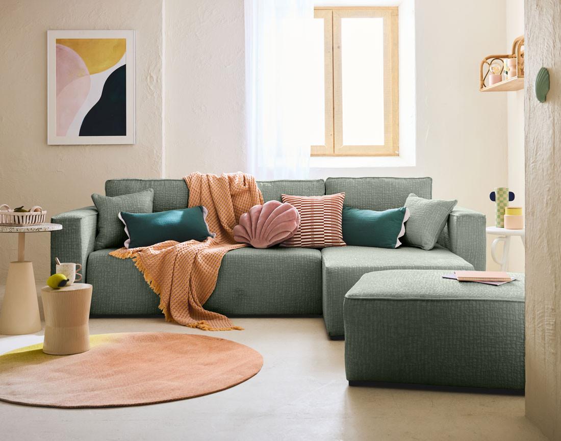 Adoptez l'allure tendance du canapé d'angle Topaze en velours relief