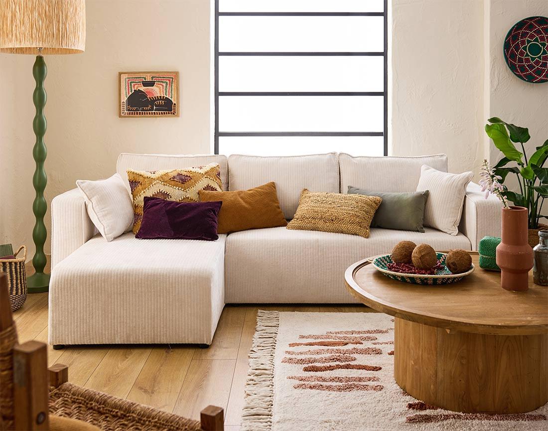 Le canapé Topaze vous fait profiter de ses atouts charmes indéniables : un velours côtelé plat hyper tendance, une assise généreuse et confortable, des accoudoirs volumineux et une douceur absolument inimitable. Il s'agit du canapé parfait pour profiter des avantages d'une méridienne tout en sublimant votre espace de vie. Son magnifique tissu s'accordera d'ailleurs parfaitement avec un intérieur aux notes douces et contemporaines : associez votre nouveau canapé avec un guéridon haut en bois clair ou à une lampe à pied d'inspiration bohème-chic, pour une décoration des plus soignées. Vous pouvez d'ailleurs choisir la couleur de votre nouveau canapé en fonction de vos goûts et du style décoratif désiré : beige, écru ou vert sauge pour un design minimaliste très en vogue, ou bleu, vert, latté ou gris pour une touche de modernité. À vous de décider !