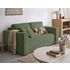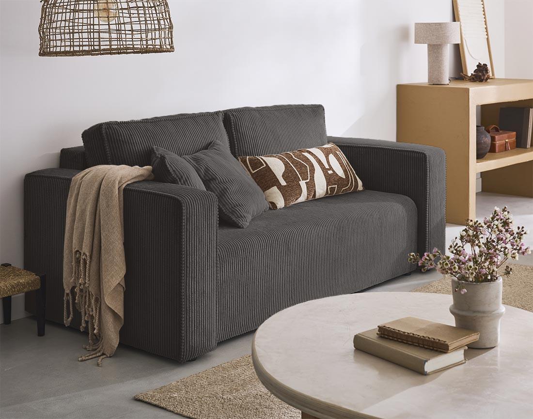 - Détail des matières : Assise : Mouse polyuréthane 28kg/m3 – Dossier : Flocons de mousse – Ressorts ondulés – Structure en bois et panneaux de particules – Revêtement en velours côtelé 100% polyester – Pieds en plastique noir