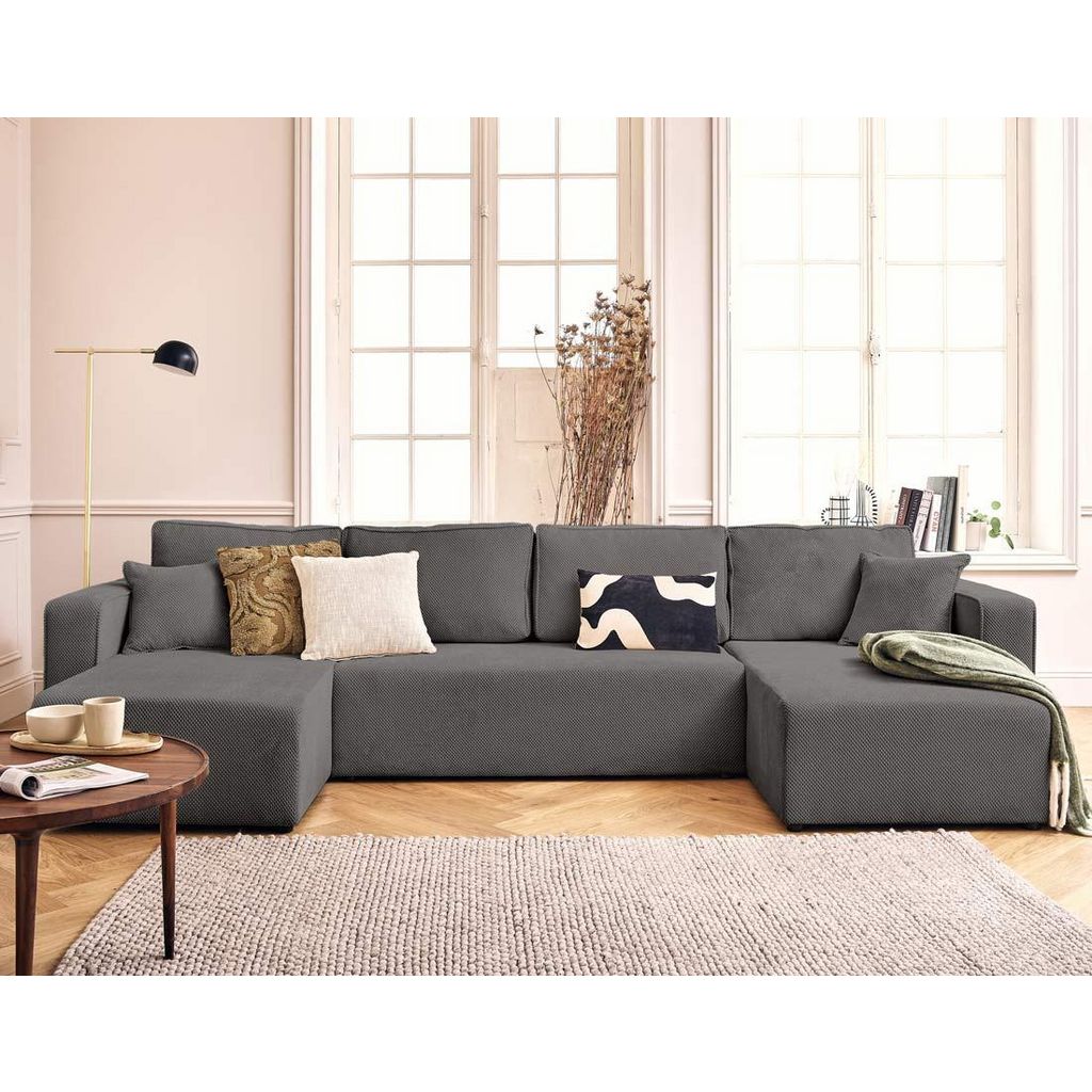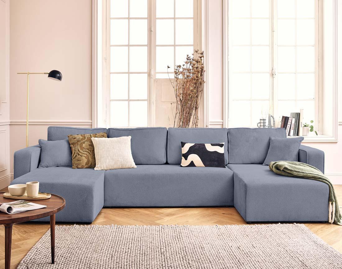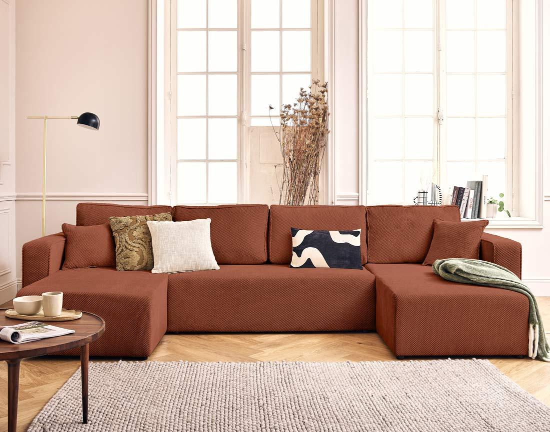 Topaze - canapé panoramique en u 7 places convertible avec coffre en velours texturé