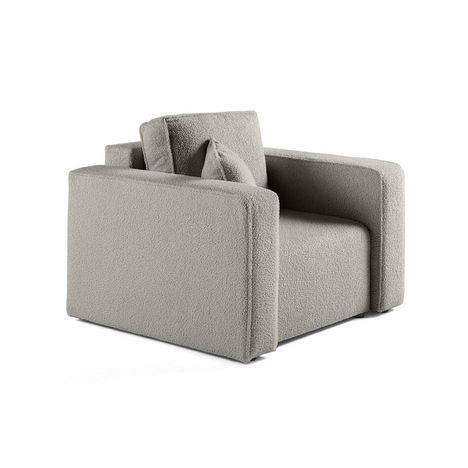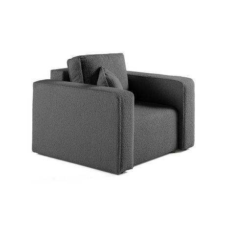 - Détail des matières : Assise : Mouse polyuréthane 28kg/m3 – Dossier : Flocons de mousse – Ressorts ondulés – Structure en bois et panneaux de particules – Revêtement en tissu bouclette 100% polyester – Pieds en plastique noir