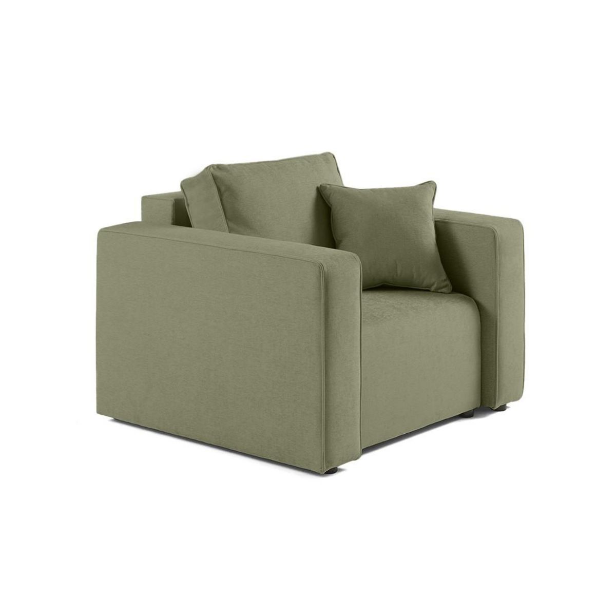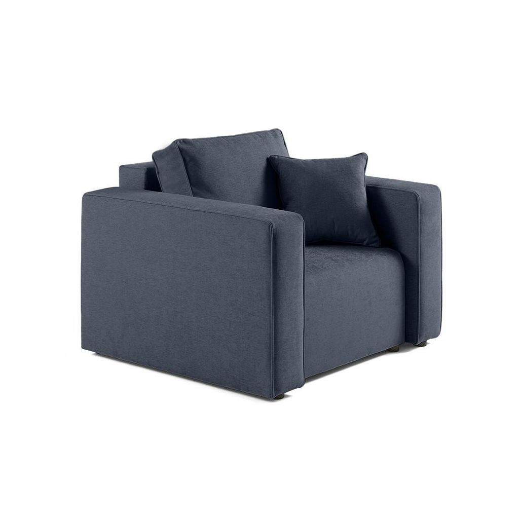 - Détail des matières : Assise : Mouse polyuréthane 28kg/m3 – Dossier : Flocons de mousse – Ressorts ondulés – Structure en bois et panneaux de particules – Revêtement en tissu 100% polyester – Pieds en plastique noir