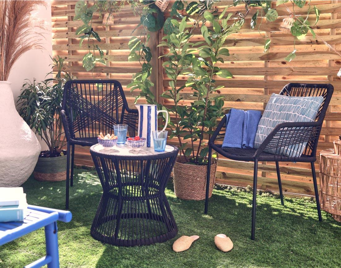 Composé de deux chaises et d'une table basse, le salon bas de jardin Zambra accueille confortablement 2 personnes. Conçu à partir de corde et de métal noir, le salon de jardin Zambra a un style résolument sobre et chic. De plus, sa table basse arbore un plateau en mosaïque blanche. Ce salon de jardin trouvera facilement sa place sur votre balcon, votre terrasse ou encore dans votre jardin.
