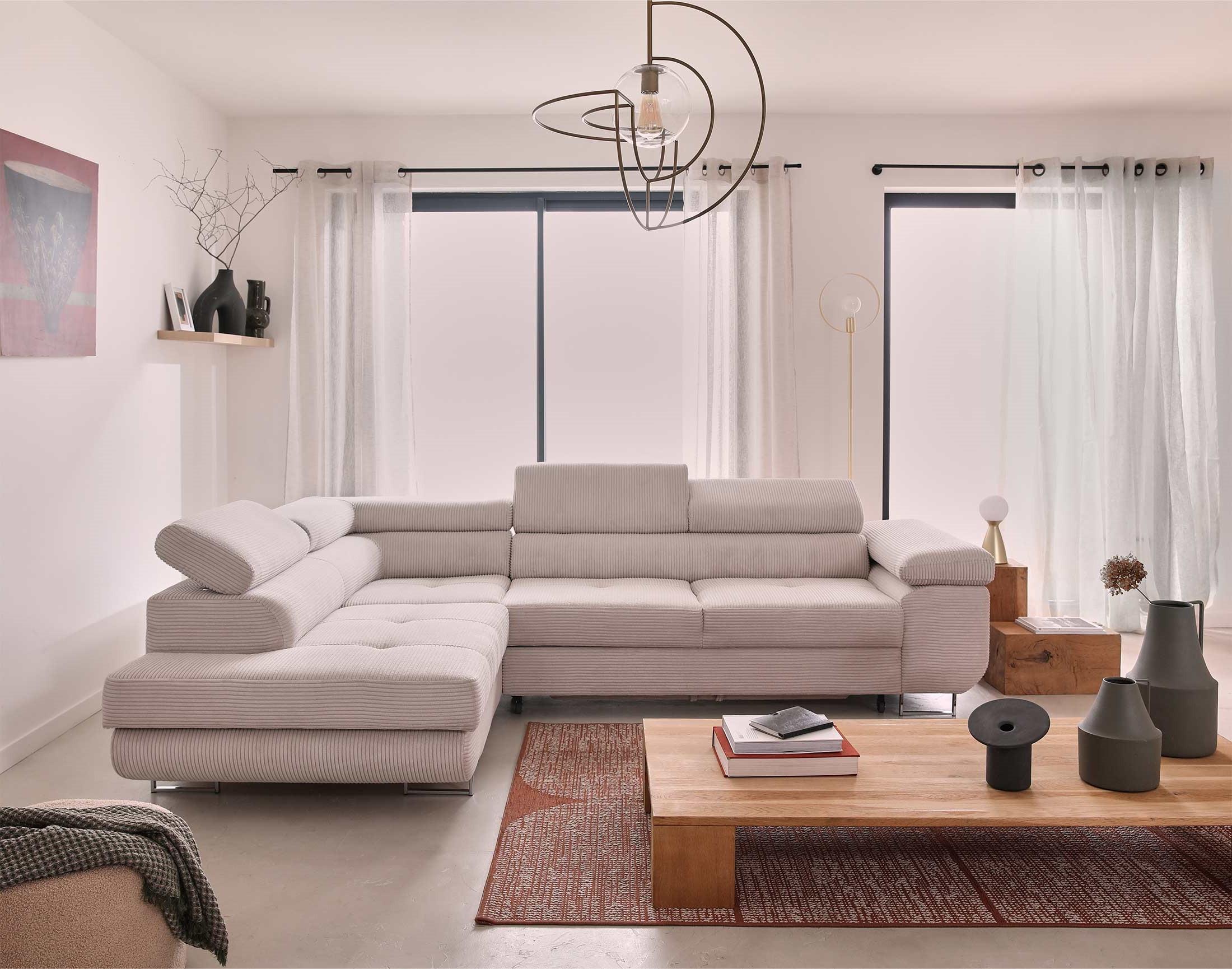 Un canapé d'angle au revêtement en velours côtelé tendance