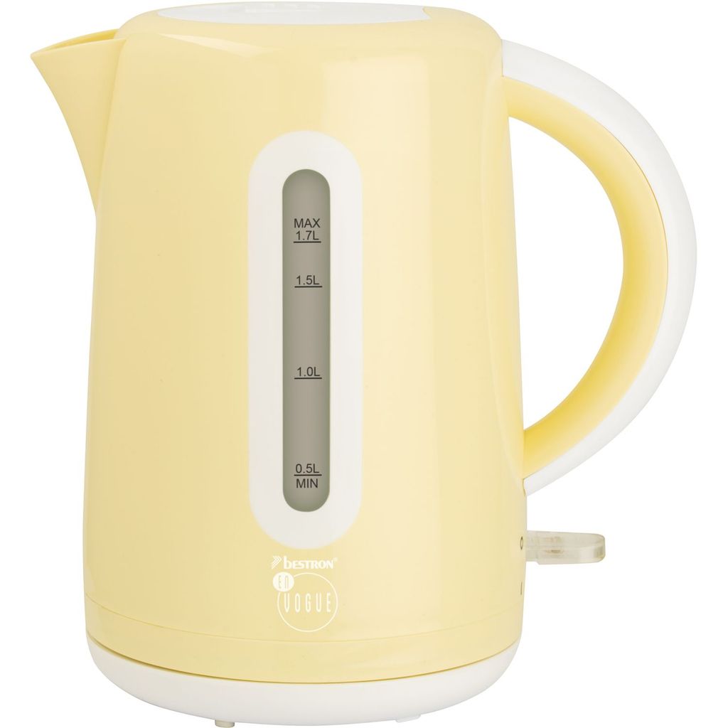 Nous vous proposons la Bouilloire Electrique en Vogue Vanille de chez Bestron. Doté d'une capacite de 1.7L, la bouilloire Vogue Vanille vous permettra de chauffer rapidement de l'eau pour vos thés ou soupes. La Bouilloire Electrique Vogue s'arrete automatiquement à ébulition.De chaque coté de la bouilloire Vogue Vanille se trouve l'indicateur gradué du niveau d'eau. En plus d'etre simple d'utilisation la Bouilloire Electrique Vogue Vanille égaiera votre cuisine par sa jolie couleur.