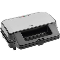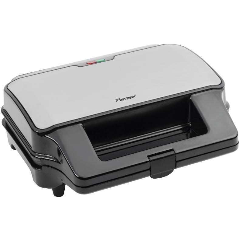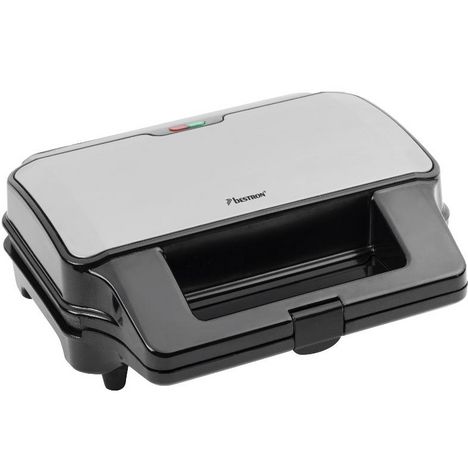 Bestron ASG90XXL Croque-gaufre-gril Bestron ASG90XXL avezc corps à parois isolantes en acier inoxydable. 3 jeux de plaques interchangeable XXL (± 15 x 28 cm) pour : 2 croque monsieur, 2 gaufres et griller des hamburgers, du poulet et du poisson. Réglage automatique de la température. Lampe témoin ?puissance? et lampe témoin ?prêt à l?emploi?. Se range à la verticale pour économiser l?espace. Plaques de cuisson amovibles avec revêtement anti-adhésif et facile à nettoyer. Grande poignée résistante à la chaleur.