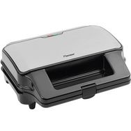 Bestron ASG90XXL Croque-gaufre-gril Bestron ASG90XXL avezc corps à parois isolantes en acier inoxydable. 3 jeux de plaques interchangeable XXL (± 15 x 28 cm) pour : 2 croque monsieur, 2 gaufres et griller des hamburgers, du poulet et du poisson. Réglage automatique de la température. Lampe témoin ?p