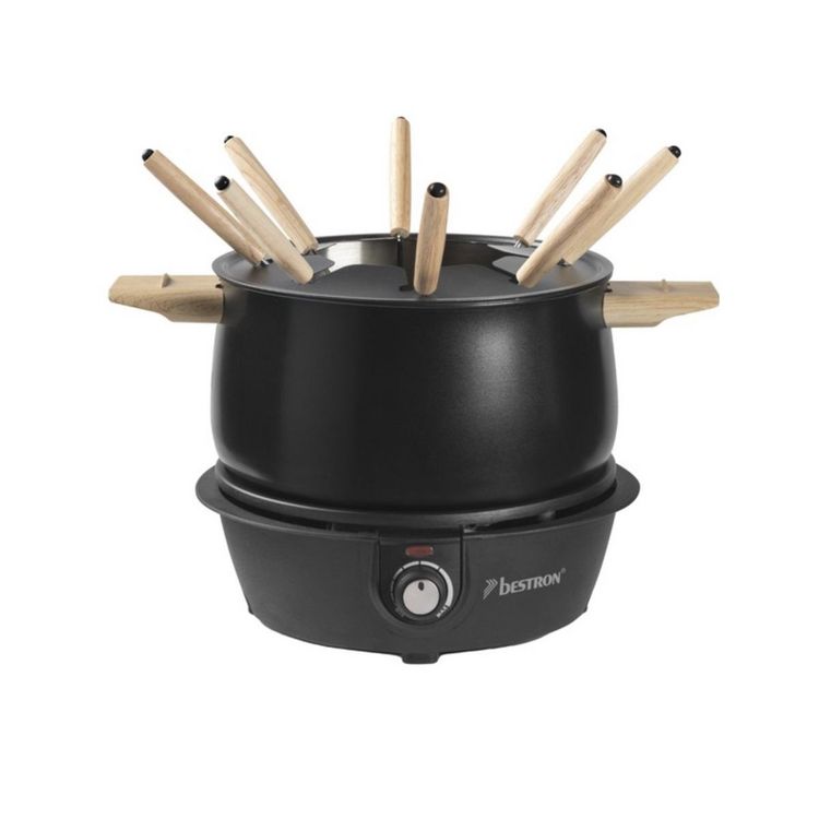 Bestron AFD850BW La Fondue Bestron AFD850BW de la série Black & Wood dispose d'un pot amovible de 1,5 l avec poignées isolées thermiquement. Grâce à une puissance de 1500 watts, l'appareil à fondue est rapidement prêt à l'emploi. Le pare-éclaboussures avec porte-fourchette évite les éclaboussures i