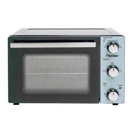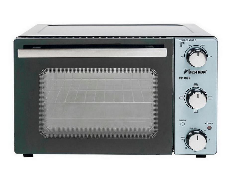 Bestron AOV20 Ce four à gril Bestron AOV20 a une puissance de 1300 watts et une capacité de 20 litres. L'AOV20 a une température min / max de 90/230 degrés. Le four est équipé d'un boîtier bien isolé pour une faible chaleur de surface et une double porte en verre, un interrupteur à 4 positions et un