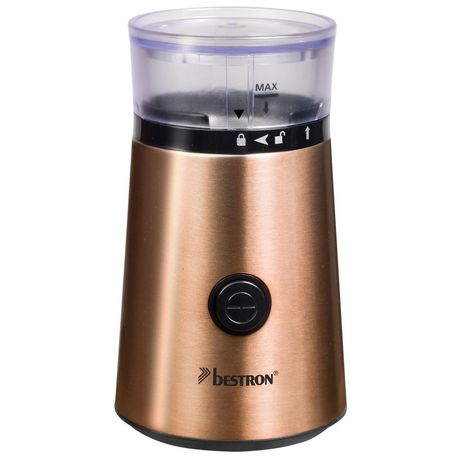 Bestron ACG1000CO Approprié pour tous les sortes des grains de café. - Moulin à caféRéservoir transparent amovibleCapacité du réservoir : 50 grammesMoteur puissantCouteau inoxCouvercle amovibleFacile à nettoyerPieds antidérapantsDimensions : 10,5 x 10,5 x 18,2 cmPoids : 0.75 kgCouleur : cuivre