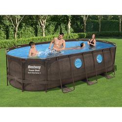 Amusez-vous en famille et entre amis dans cet ensemble de piscine Power Steel Swim Vista Series de la marque Bestway. La forme ovale offre plus d'espace pour la natation et le jeu. Cette piscine hors sol allie durabilite et style et l'impression a l'aspect de rotin ajoutera une touche de luxe a votre jardin ou votre arriere-cour.