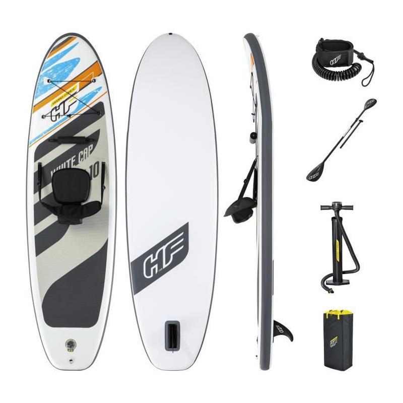 Paddle SUP White Cap Hydro-Force - 305x84x12 cm - 1 personne jusqu'a 120 kg - Contenu : 1 aileron amovible, leash, pompe a main - Peut etre utilisé comme kayak ou comme Paddle SUP - Pagaie réglable en aluminium en 4 pieces de 2,17 m - Siege de kayak amovible avec dossier et cale-pieds - Fabriqué en DropStitch et PVC
