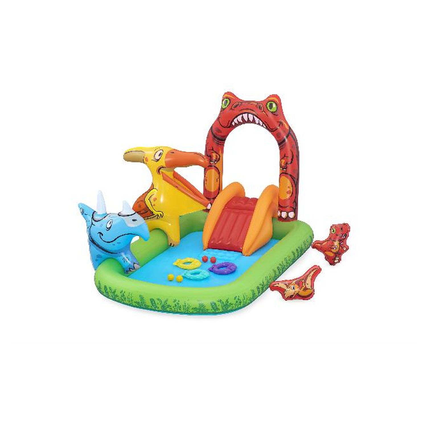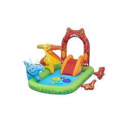 Ce centre de jeu est idéal pour les enfants qui aiment les dinosaures. Il est équipé d'une large gamme de dinosaures et de jeux différents. Par exemple, il y a un toboggan avec un arroseur au sommet qui est facile à utiliser avec un tuyau d'arrosage. Il existe également deux jeux de lancer distincts, avec des balles dans la bouche et des anneaux sur la corne.