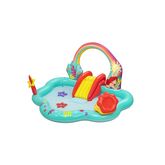 Que les plaisirs de l'été commencent avec le centre de jeux aquatiques Disney® La Petite Sirène ! Gonflez simplement le centre de jeu aquatique, remplissez la piscine d'eau, connectez un tuyau d'arrosage (non inclus) à l'arche pour activer les arroseurs d'eau intégrés. L'arche est dotée d'un toboggan intégré pour plus de sécurité et regardez vos enfants lancer 3 anneaux en forme d'étoile sur les coraux. Le jeu de lancer de balles coquillages avec les 6 balles incluses offrira également un plaisir sans fin. Lorsque les enfants ont fini de barboter et de jouer, il suffit de vider l'eau à l'aide du robinet de vidange pratique. Le centre de jeux aquatiques peut fonctionner avec ou sans eau et offre du plaisir et de l'excitation toute l'année