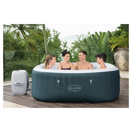 Spa gonflable carré, de bonne taille pour 3 adultes allongés et 4 assis.
