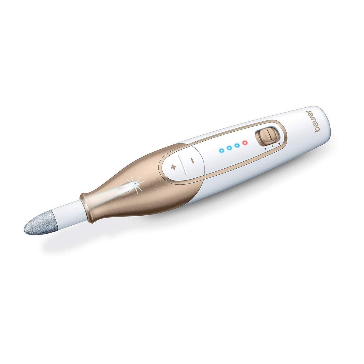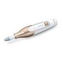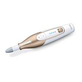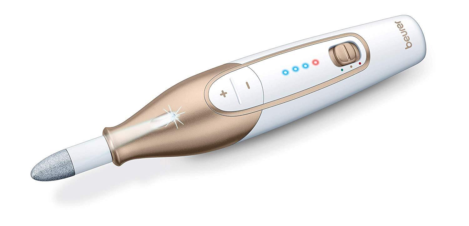 Beurer MP64 Set de manucure et pédicure rechargeable Beurer MP64 doté d'une batterie Lithium-Ion puissante. Avec 10 embouts de haute qualité pour les soins des ongles et de la peau. Ecran Magic LED - apparaît uniquement pendant le fonctionnement. Le MP64 : pour des mains et des pieds soignés, avec la lumière LED, le design ergonomique empêche de glisser pendant l'utilisation.10 embouts de haute qualité en saphir et feutre :1. Cône saphir: élimination de la peau sèche ou callosités de la plante du pied et des talons ou pour la manucure des ongles.2. Disque saphir, fin: remplissage et traitement des ongles, grain fin.3. Disque saphir, gros: remplissage et traitement des ongles, gros grain.4. Râpe callosités saphir: élimination rapide des callosités épaisses des talons.5. Fraise flamme: pour éliminer les ongles incarnés.6. Fraise cylindrique: pour polir et lisser la surface des ongles lignifiés.7. Cône en feutre: pour lisser et polir le bord des ongles après le remplissage ainsi que pour nettoyer la surface de l'ongle.8. Fraise ronde: Pour une élimination efficace des cuticules sur la plaque de l'ongle et sur le bord de l'ongle.9. Fraise à aiguilles.10. Ponceuse anti-callosité en cristal: utilisée pour éliminer les callosités de la semelle et des talons.