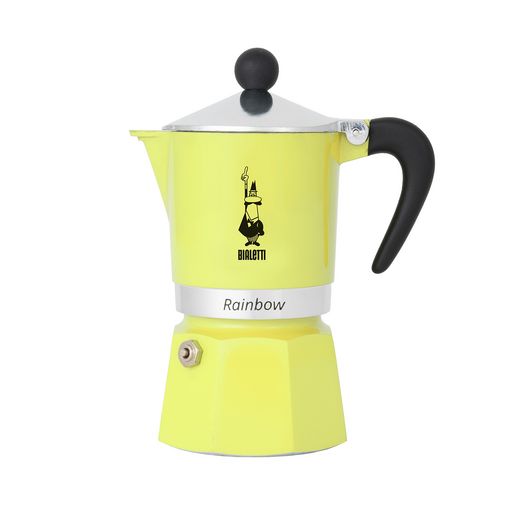 Cafetière italienne 6 tasses jaune pastel - Rainbow - Une cafetière qui apporte de la gaieté dans la cuisine ! Cette cafetière apportera l'odeur du café fraîchement préparé et un rayon de joie dans votre cuisine avec toutes ses belles couleurs ! Faites un café au goût et aux accents italiens dans le respect de la tradition : vous pourrez ainsi savourer de délicieux cafés au goût d'Italie! Mettez de l'eau dans la cuve du bas, placez le café dans l'entonnoir, faites chauffer la cafetière et obtenez un délicieux café ! En aluminium. Poignée et bouton en bakélite. Soupape de sécurité. Tous feux sauf induction.