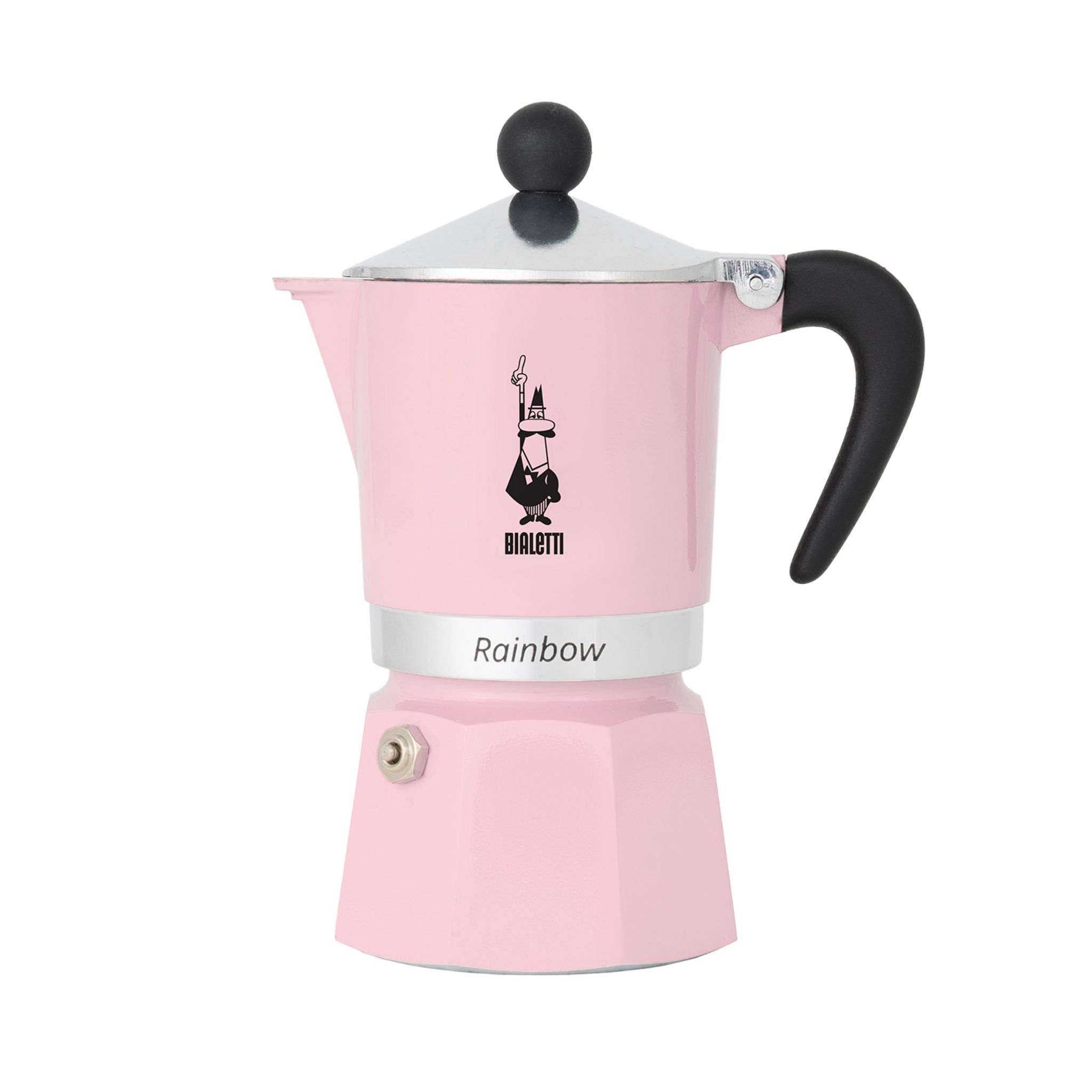 Cafetière italienne 6 tasses Rose Pastel - Rainbow - Une cafetière qui apporte de la gaieté dans la cuisine ! Cette cafetière apportera l'odeur du café fraîchement préparé et un rayon de joie dans votre cuisine avec toutes ses belles couleurs ! Faites un café au goût et aux accents italiens dans le respect de la tradition : vous pourrez ainsi savourer de délicieux cafés au goût d'Italie! Mettez de l'eau dans la cuve du bas, placez le café dans l'entonnoir, faites chauffer la cafetière et obtenez un délicieux café ! En aluminium. Poignée et bouton en bakélite. Soupape de sécurité. Capacité 6 tasses italiennes (6 x 5 cl).