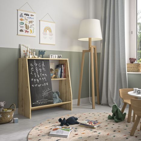 La bibliothèque enfant ludique, conçue pour les tout petits est une structure basse munie d'une tablette inclinée pour y ranger jouets et peluches sans les faire tomber. Mais aussi d'une étagère et d'une ardoise qui permettra de laisser libre imagination à votre enfant pour dessiner à la craie.