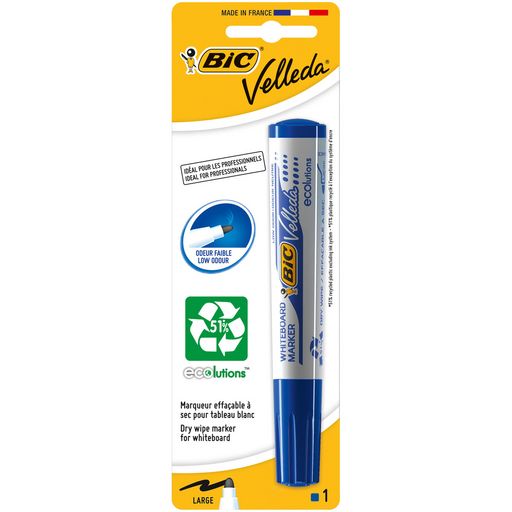 En savoir +Idéal pour les professionnels, le feutre effaçable à sec BIC Velleda 1701 à pointe ogive présente les informations avec clarté et style. Son encre bleue s'efface à sec très facilement même après plusieurs jours et dégage peu d'odeur, idéal si vous écrivez longtemps. Ce marqueur effaçable est fabriqué en France avec 51% de matière recyclée (à l'exception du système d'encre).