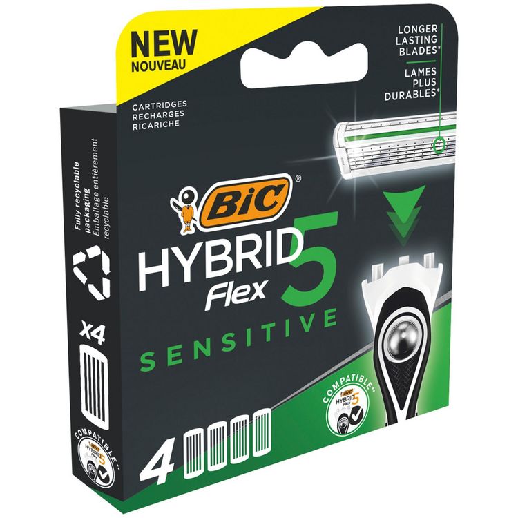 Pack de 4 lames de rechange pour le rasoir masculin BIC Hybrid 5 Flex Sensitive, cliniquement prouvé pour peaux sensibles et anti-irritationGlisse ultra-fluide grâce à une bande lubrifiante pour peaux sensibles enrichie à la vitamine E, à l'aloe vera