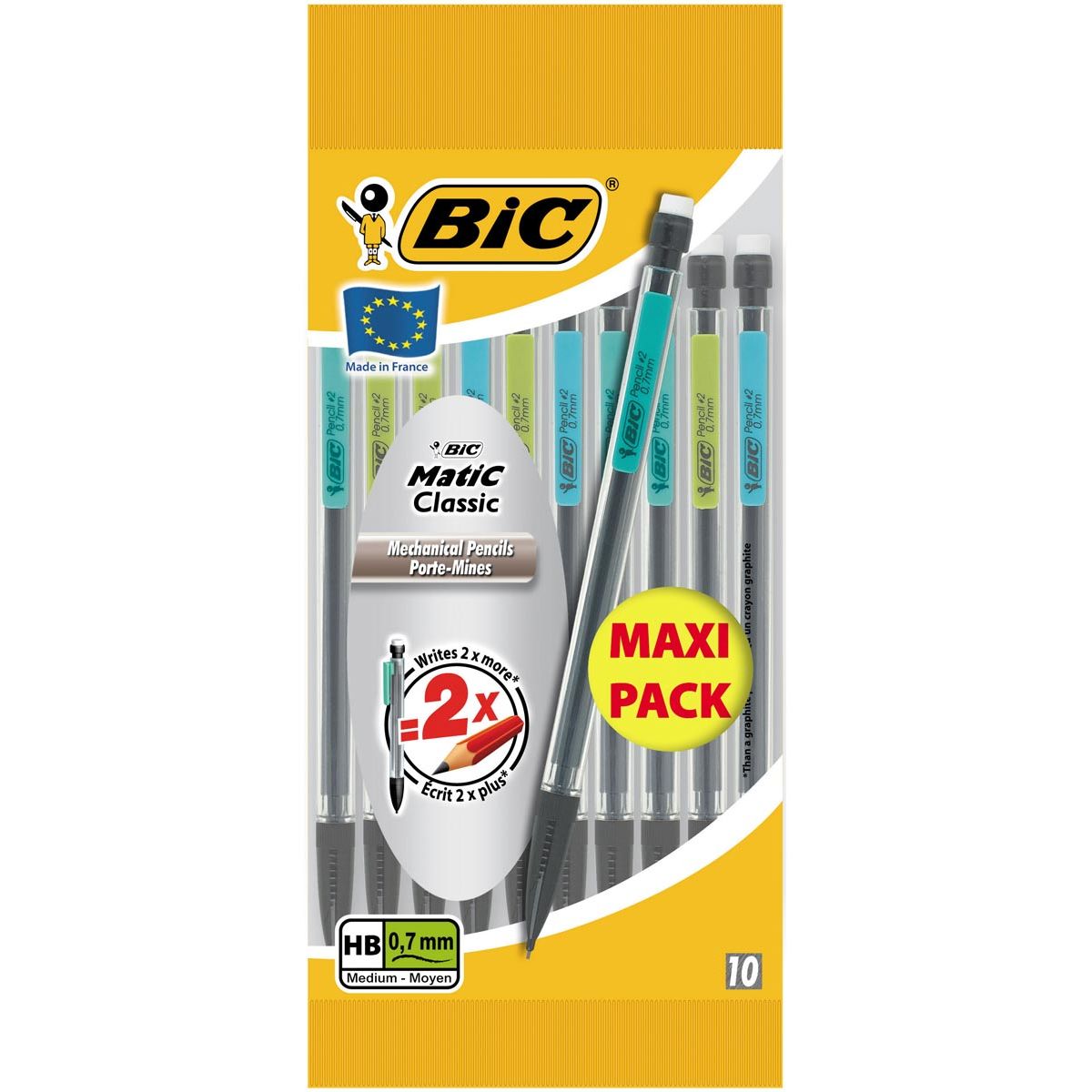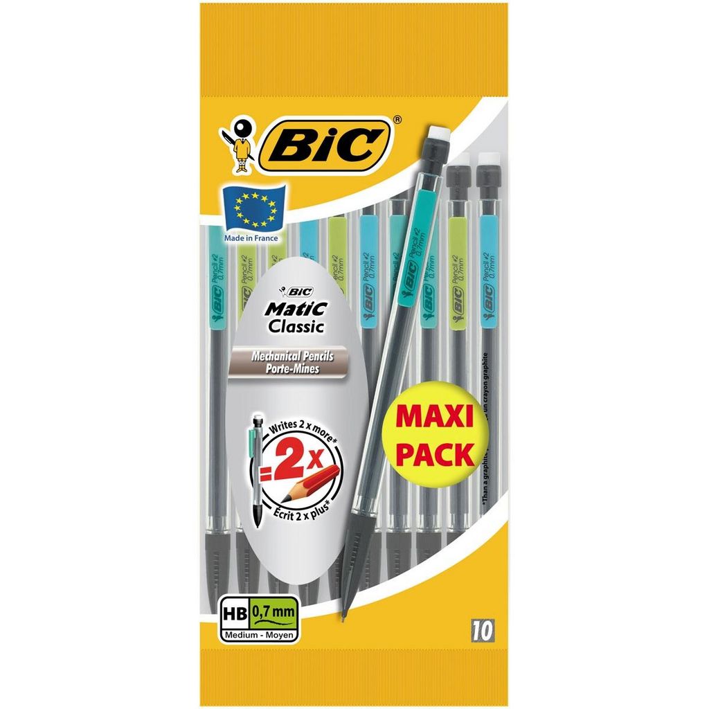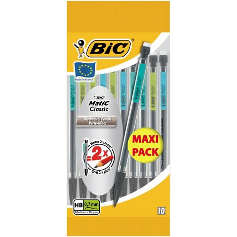 Léger, robuste et efficace, l'indémodable porte-mines BIC Matic Classic est le modèle de porte-mines le plus vendu en France. Ces 10 porte-mines sont fournis avec 3 mines HB 0,7 mm de 9 cm: ni trop fines ni trop épaisses, leur solidité convient à tous les types d'écriture. Grâce à leur gomme blanche