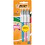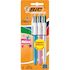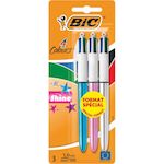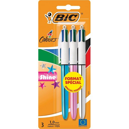 Ces 3 stylos BIC 4 Couleurs Shine se parent d'un revêtement brillant, moderne et métallique : argent, bleu, rose ou violet (aléatoire). Ils ont 4 pointes moyennes de 1,0 mm (bleu, noir, rouge, vert) convenant à tout type d'usage : écrire, dessiner, organiser ses notes ou créer un "bullet journal". Grâce à leur bouton poussoir, changez de couleur en un clic sans jamais changer de stylo.