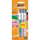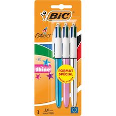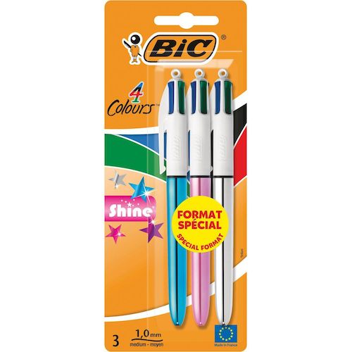 Ces 3 stylos BIC 4 Couleurs Shine se parent d'un revêtement brillant, moderne et métallique : argent, bleu, rose ou violet (aléatoire). Ils ont 4 pointes moyennes de 1,0 mm (bleu, noir, rouge, vert) convenant à tout type d'usage : écrire, dessiner, organiser ses notes ou créer un "bullet journal". G