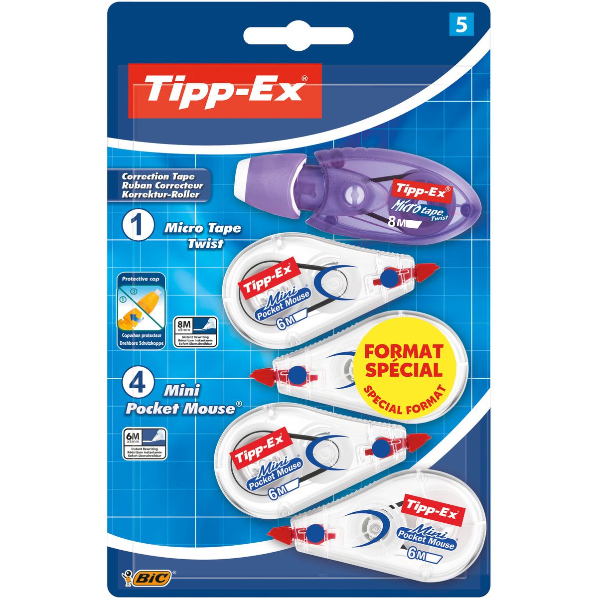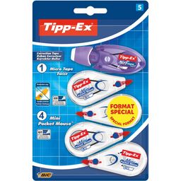 Réécrire par-dessus est un jeu d'enfant et offre un résultat final toujours professionnel. La souris Tipp-Ex Mini Tape Twist se distingue par sa tête pivotante qui protège sa pointe correctrice et ses 8 m de ruban blanc opaque. L'ensemble de ces correcteurs affiche une simplicité d'utilisation renforcée par l'ingéniosité signature de la collection : adaptés aux droitiers comme aux gauchers, ils ne déraillent jamais et sont équipés d'un système de rembobinage en cas de détente du ruban. Un lot de 5 souris correctrices qui vous suivront toute l'année et se glissent partout grâce à leur format mini !