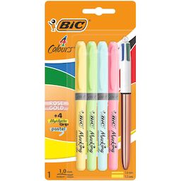 Avec ce lot de 5 produits hauts en couleur, BIC ne fait pas dans la discrétion ! Retrouvez 1 stylo-bille BIC 4 Couleurs Or Rose et 4 surligneurs BIC Highlighter Grip Pastel qui annoncent la couleur sans détour. Vous pourrez compter sur l'ingénieux système 4 Couleurs signé BIC : 4 pointes moyennes de 1,0 mm et de couleurs différentes (bleu, rouge, noir, vert) réunies dans un seul stylo. Pour passer de l'une à l'autre, il suffit de faire clic ! Ce stylo écrit environ 8 km au total, soit 2 km en moyenne par pointe. Durable et rechargeable ! Avec leur corps rond bicolore, leur boule percée en embout et leur clip pour les emporter partout, les stylos-bille BIC 4 Couleurs ne vous laisseront jamais tomber. En complément, 4 surligneurs fluo BIC Highlighter Grip Pastel adoptent les couleurs phares du moment !