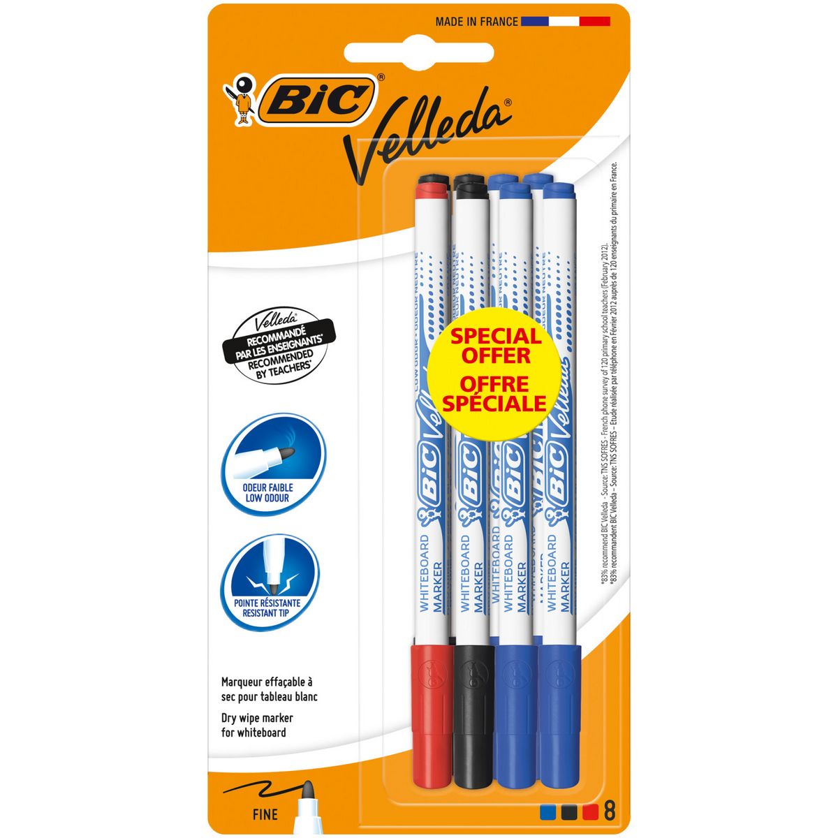 Lot de 8 marqueurs pour tableau blanc effaçables à sec pointe conique fine noir/bleu/rouge VELLEDA
